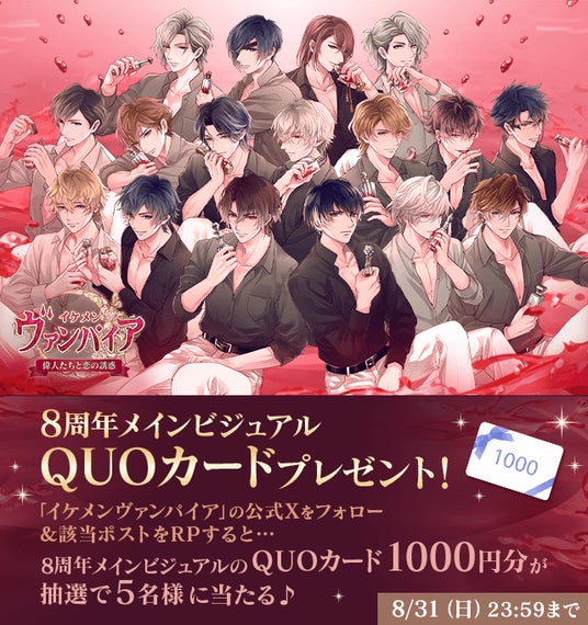 8周年を記念して、公式X(https://x.com/IkemenVampire)をフォローのうえ該当ポストをRPいただくと、8周年メインビジュアルのQUOカード(1,000円分)が抽選で【5名様】に当たるキャンペーンを実施します。