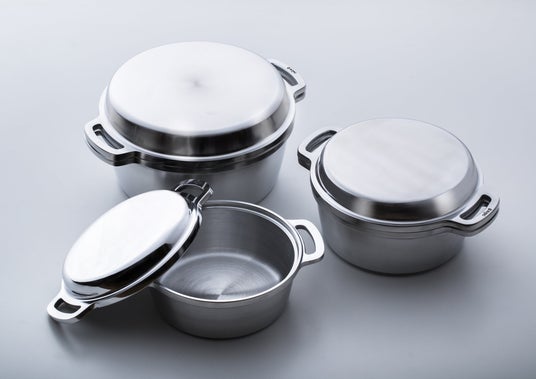 1953 年に広島で開発された“無水鍋”の復刻版モデル。熱伝導性がよく耐久性に優れた厚手アルミニウム鋳物製で、無水調理はもちろん、1鍋で8通りの調理法が楽しめる多機能鍋です。