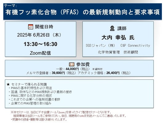 先端技術情報や市場情報を提供している(株)シーエムシー・リサーチ(千代田区神田錦町: https://cmcre.com/ )では、 各種材料・化学品などの市場動向・技術動向のセミナーや書籍発行を行っておりますが、 このたび「有機フッ素化合物(PFAS)の最新規制動向と要求事項」と題するセミナーを、 講師に大内 幸弘 氏(SGSジャパン(株)C&P Connectivity 化学物質管理 技術顧問)をお迎えし、2025年6月26日(木)13:30より、 ZOOMを利用したライブ配信で開催いたします。 受講料は、 一般:44,000円(税込)、 弊社メルマガ会員:39,600円(税込)、 アカデミック価格は26,400円(税込)となっております(資料付)。