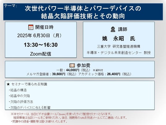 先端技術情報や市場情報を提供している(株)シーエムシー・リサーチ(千代田区神田錦町: https://cmcre.com/ )では、 各種材料・化学品などの市場動向・技術動向のセミナーや書籍発行を行っておりますが、 このたび「次世代パワー半導体とパワーデバイスの結晶欠陥評価技術とその動向」と題するセミナーを、 講師に姚 永昭 氏(三重大学 研究基盤推進機構 半導体・デジタル未来創造センター 教授)をお迎えし、2025年6月30日(月)13:30より、 ZOOMを利用したライブ配信で開催いたします。 受講料は、 一般:44,000円(税込)、 弊社メルマガ会員:39,600円(税込)、 アカデミック価格は26,400円(税込)となっております(資料付)。