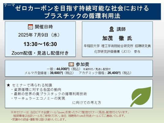 先端技術情報や市場情報を提供している(株)シーエムシー・リサーチ(千代田区神田錦町: https://cmcre.com/ )では、 各種材料・化学品などの市場動向・技術動向のセミナーや書籍発行を行っておりますが、 このたび「ゼロカーボンを目指す持続可能な社会におけるプラスチックの循環利用法」と題するセミナーを、 講師に加茂 徹 氏 氏(早稲田大学 理工学術院総合研究所 招聘研究員 化学研究評価機構(JCII) 参与)をお迎えし、2025年7月9日(水)13:30より、 ZOOMを利用したライブ配信(見逃し配信付き)で開催いたします。 受講料は、 一般:44,000円(税込)、 弊社メルマガ会員:39,600円(税込)、 アカデミック価格は26,400円(税込)となっております(資料付)。
