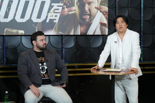 先行してシルエットが公開されていた“金メダリスト”と“RIZIN選手”。その正体が、4月10日(金)夜7時より放送された特別番組『ウルフアロンから3カウント取ったら1000万円 調印式』にて、ついに明かされました。番組内ではウルフと挑戦者が初対面(※把瑠都、糸井はリモート出演)。一触即発の空気の中、いかなることが起きても自己責任とする「誓約書」への署名が行われるなど、本番直前のヒリヒリとした空気感をお届けいたしました。
