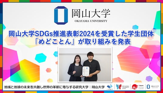 国立大学法人岡山大学(本部:岡山市北区、学長:那須保友)は2025年5月14日、本学部局連絡会において、「2024年度岡山大学SDGs推進表彰」の受賞団体による取り組み発表を行いました。本表彰では、「教育分野」「研究分野」「その他職場貢献等分野」「学生グループ分野」の4分野において、応募または推薦により受賞団体が決定。当日は「学生グループ分野」で優秀賞を受賞した「めどことん」が表彰されました。