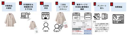 対象ブランドの店頭商品にCO2排出量情報を確認できる二次元コード記載のタグをつけ、その情報を閲覧した消費者によるアンケート結果や売上データなどを基に、購買行動への変容を検証します。