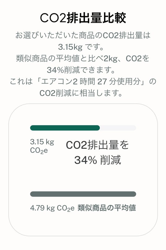 1製品あたりのCO2排出量の目安については、「エアコンの使用時間」として表記することで、消費者にとってより身近に感じられるエネルギーを提示します。