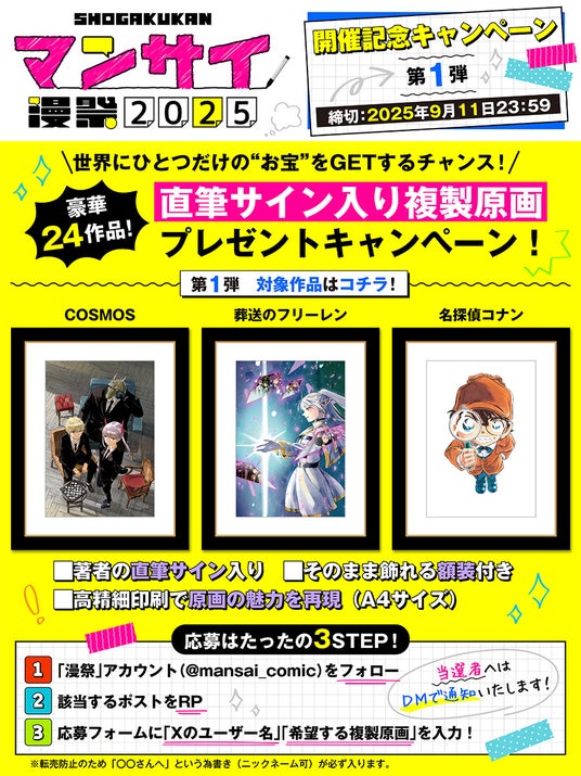 「漫祭2025」の開催を記念して、 毎週金曜に「漫祭」公式Xにて、『名探偵コナン』や『葬送のフリーレン』など、豪華24作品の著者直筆サイン入り複製原画を額装し、各1名様にプレゼントするキャンペーンを実施いたします。ここでしか手に入らない、世界にひとつだけの“お宝”をGETするチャンス、お見逃しなく!