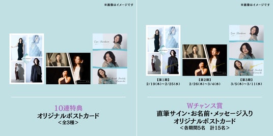 「Wチャンス賞」では10連特典のポストカードが直筆サイン・お名前・メッセージ入りになるチャンスも!ポストカードのデザインは期間毎にかわるので要チェックです。