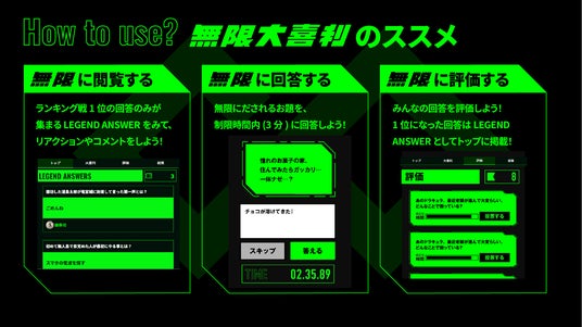 新たにオープンした「無限大喜利」は、野田クリスタル発案のもと開発された大喜利プラットフォームです。従来の大喜利サイトで課題となっていた、お題の制約や評価までの時間といった問題を解消し、ユーザー同士が大喜利を通じて双方向でコミュニケーションを取れることを目指しています。大喜利ファンからプロの芸人まで、誰もが楽しめる環境を提供します。
