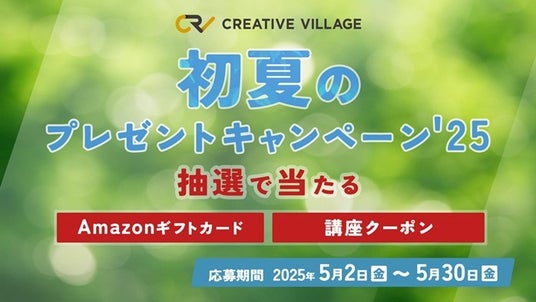 株式会社クリーク・アンド・リバー社(以下C&R社)が運営するクリエイターのための情報サイト「CREATIVE VILLAGE」は、アンケートにご回答いただいた方から抽選でAmazonギフトカードやC&R社が運営する有料講座でご利用いただけるクーポンをプレゼントする「初夏のプレゼントキャンペーン'25」を本日5月2日(金)よりスタートさせます。