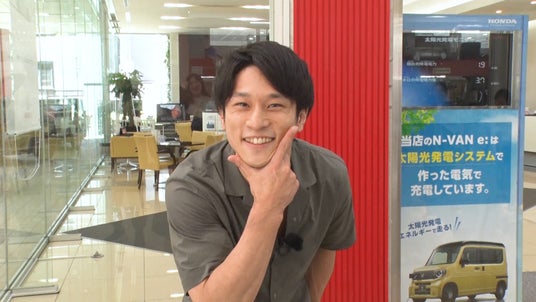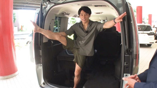 まずは、スタートの地「Honda Cars 東京中央 桜新町店」で、最新車種や人気モデルを見ていくことに。谷川選手は、長田と共にTポーズを披露したり、ボケに乗ったりと、場を和ませていきます。そんななか、谷川選手もすっぽりとおさまるほど、後部座席が広いクルマが紹介されました。「(車内で)練習もできる」と声をかけられた谷川選手はY字バランスを披露。向井は「サービス精神がすごいって!」と反応します。