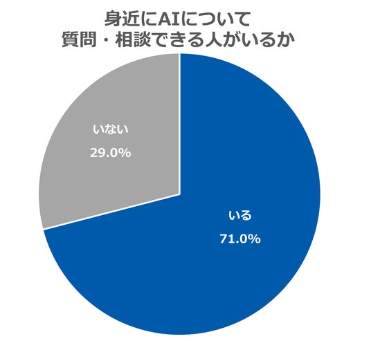 ・ 「身近にAIについて質問、相談できる人がいるか」という質問に対しては、「いる」と回答した人が71.0%で、周囲の仲間と相談しあってAI活用を推進できる環境が整ってきていることもわかりました。