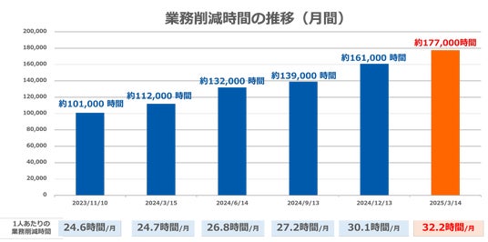 ・ 生成AIの活用で、ひと月あたり約17.7万時間(前回調査差+約1.6万時間)の削減、1人あたり約32.2時間(前回調査差+約2.1時間)の削減を実現しました。