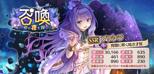 4月17日より、SSRプリシラ【宵闇に咲く眩き才賢】がピックアップされている『一夜の花を探しに召喚』『一夜の花を探しにステップアップ召喚』が期間限定開催!