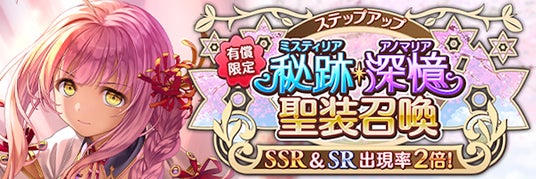 ステップアップ召喚では5ステップごとにSSR聖装が1着確定、うちSSRプリシラ【宵闇に咲く眩き才賢】は50%の確率で出現します!