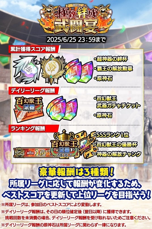 ダメージ上限が難易度ごとに上昇するので、パーティー編成を工夫しボスに挑みましょう。報酬は豪華3種類!限界突破アイテムや「神器の解放チャンク」もラインナップに含まれていますので、上位リーグを目指してみてください。