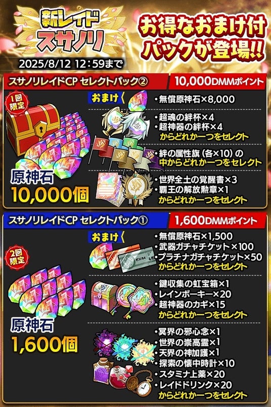 原神石に加えて、ガチャチケットや限界突破アイテムなど、お好きなアイテムを選択できる「スサノリレイドキャンペーンセレクトパック」が2種登場!