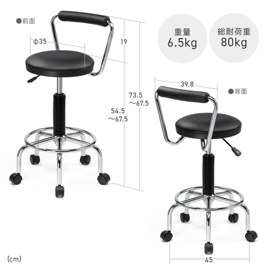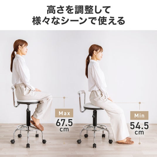 用途や作業内容に応じて高さを54.5~67.5cmの範囲で調整可能。作業台の高さや利用者の体格に合わせ、最適な姿勢で作業できます。姿勢の負担を抑えつつ、作業に集中できる環境をサポートします。