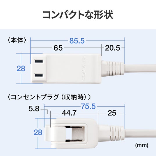 タップ本体はTAP-M601Wが28×71.5mm、TAP-M701Wが28×85.5mm、TAP-M801Wが28×99.5mm、コンセントプラグ部分は28×75.5mmとコンパクトなサイズです。