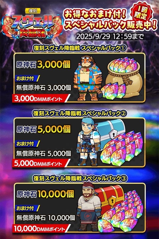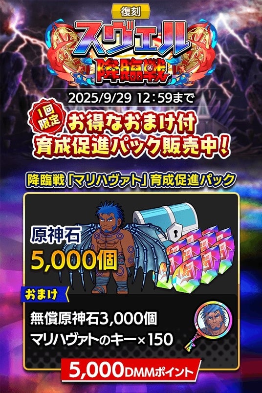 「復刻 スヴェル降臨戦」開催、「マリハヴァト」の登場を記念して原神石に加え、育成素材が入手できてお得な「降臨戦「マリハヴァト」育成促進パック」と、「復刻スヴェル降臨戦スペシャルパック」も3種登場!こちらも是非お見逃しなく!