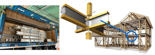(左)コンテナへの積み込みの様子、(右)貨物鉄道輸送をしている部材「テクノビーム」