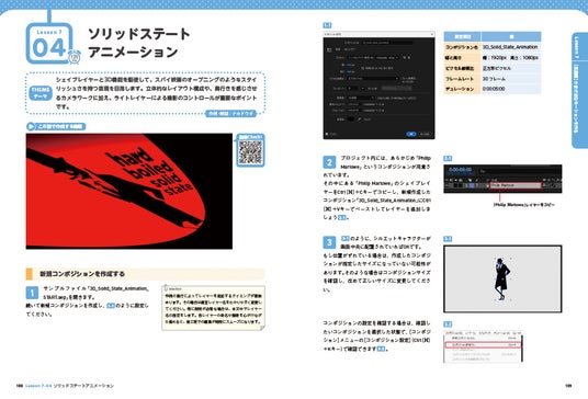 本書は基礎編と発展編の2部構成になっており、基礎編では1つのモーショングラフィックス作品を制作する過程を通じて、After Effectsの基本操作と知識を体系的に学びます。解説と連動した動画も用意されているので、つまずきやすいポイントもしっかりサポートされています。