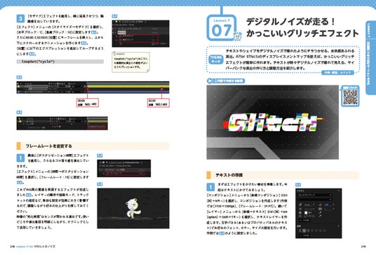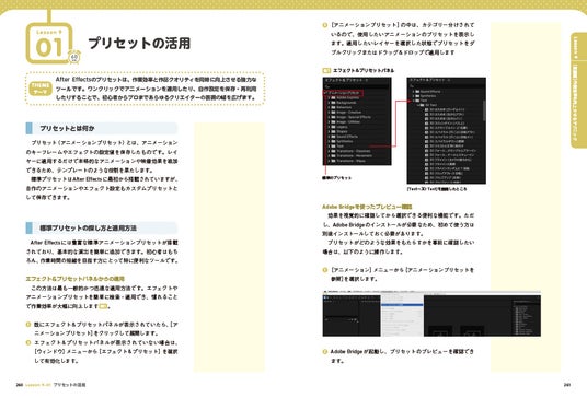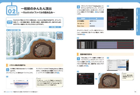一方、発展編では、9つの多彩な作例を通じてモーショングラフィックスの表現力を広げられます。さらに、エクスプレッションや効率的な操作方法など、より高度なテクニックを習得することができます。LessonごとのAEPファイルもダウンロードできるので、実際にファイルを操作しながら解説を読み進めることが可能です。