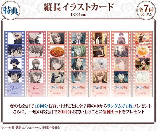 一度のお会計で10回分ご購入ごとに特典縦長イラストカード(全7種)の中からランダムで1枚、20回分ご購入ごとに全種セットプレゼント!