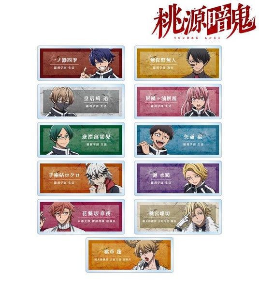 一ノ瀬四季、無陀野無人、皇后崎 迅、屏風ヶ浦帆稀、遊摺部従児、矢颪 碇、手術岾ロクロ、漣 水鶏、花魁坂京夜、桃宮唾切、桃草 蓬のイラストをアクリルネームプレートに仕上げました。