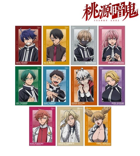 一ノ瀬四季、無陀野無人、皇后崎 迅、屏風ヶ浦帆稀、遊摺部従児、矢颪 碇、手術岾ロクロ、漣 水鶏、花魁坂京夜、桃宮唾切、桃草 蓬のイラストと作品ロゴを、プラスチックカードに仕上げました。