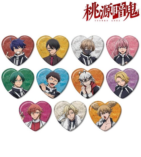 一ノ瀬四季、無陀野無人、皇后崎 迅、屏風ヶ浦帆稀、遊摺部従児、矢颪 碇、手術岾ロクロ、漣 水鶏、花魁坂京夜、桃宮唾切、桃草 蓬のイラストをハート型の缶バッジに仕上げました。