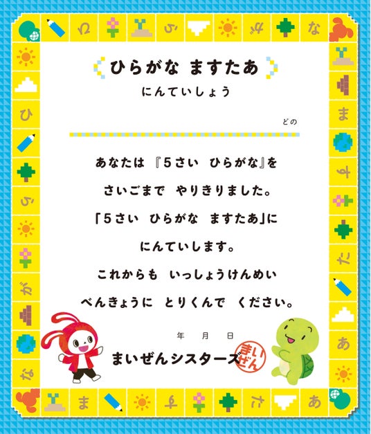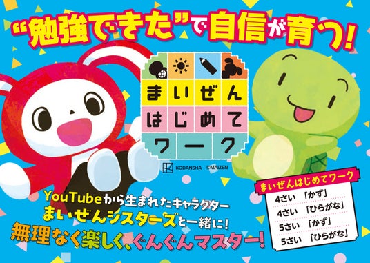 Youtubeから生まれ、マインクラフト動画などで人気を集めている「まいぜんシスターズ」。うさぎの「ぜんいち」とカメの「マイッキー」など、子どもにとっても身近で大好きなキャラクターたちです。そんな彼らを起用した幼児ワーク(ドリル)の新シリーズ『まいぜんはじめてワーク』(ひらがな4さい/ひらがな5さい/かず4さい/かず5さいの計4冊)が誕生しました!
