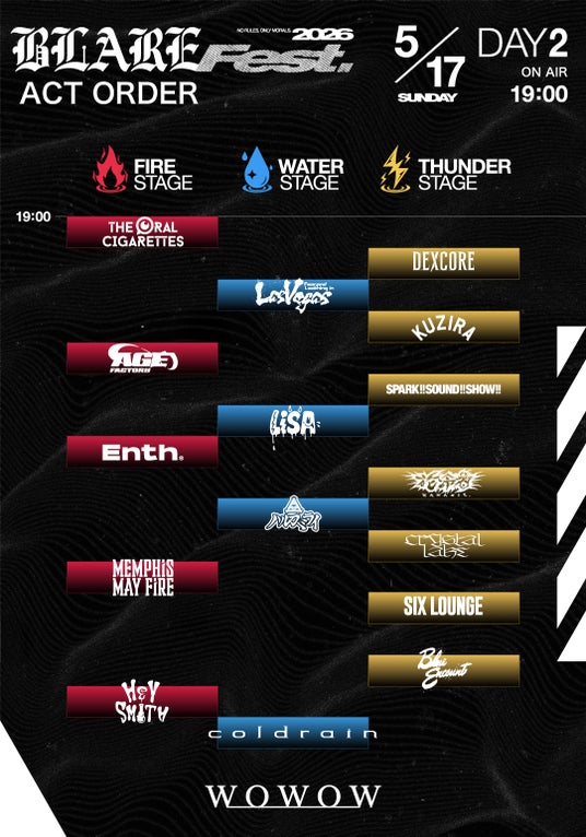 2月7日(土)、8日(日)に愛知・ポートメッセなごやで開催され、両日完売となったcoldrain主催の大型音楽フェス「BLARE FEST. 2026」。2日間のライブの模様は5月16日(土)、17日(日)にWOWOWで独占放送・配信される。この度、フェスに集結した国内外の豪華出演者から総勢32組のステージをオンエアすることが決定した。同時に、各アーティストのオンエアされる順番も画像で公開。