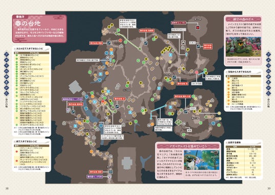恋愛対象キャラクターの詳細なプロフィール、好み、戦闘スタイルを掲載。彼らとの絆を深める手助けとなるでしょう。さらに、「春の里」と「夏の里」の詳細マップでは、重要アイテムやレシピ、素材の入手場所を網羅し、序盤の冒険を強力にサポートします。A5判サイズで、手元でいつでも確認可能です。