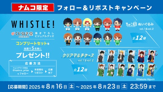 期間中に対象の投稿をリポストした方の中から抽選で5名様に「ホイッスル! ちょこ友12種&クリアマルチケース12種コンプリートセット」をプレゼント!
