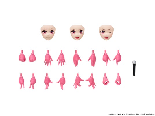 有馬かなの劇中衣装に合わせた可動機構により、ライブ中の歌って踊るシーンなど、特徴的なポーズを再現可能。表情パーツとして「笑顔」「自信顔」「ウインク顔」の3種類が付属、オプションパーツには「マイク」「手首パーツ8種」「ディスプレイ用台座2種セット」が付属して劇中の姿を再現します。