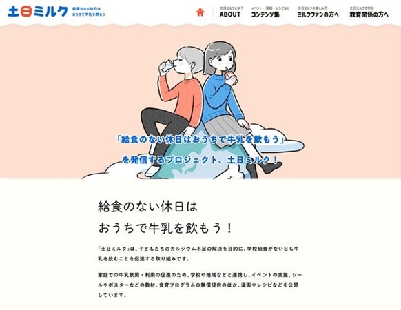「土日ミルク」は、学校給食がない日でも子どもたちに楽しく牛乳を飲みたい・乳製品をとりたいと思ってもらえる意識づくりや、環境づくりを促すために実施されている取り組みだ。