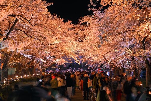 高田公園の桜は上野の恩賜公園、弘前城公園とともに、日本三大夜桜の一つに数えられ、「高田城址公園観桜会」は、2025年で第100回を迎える。公園周辺には約4,000本の桜があり、夜になるとぼんぼりに照らされ、美しい桜とライトアップされた高田城三重櫓が堀の水面に映るさまは実に幻想的。人々に感動をもたらす絶景だ。