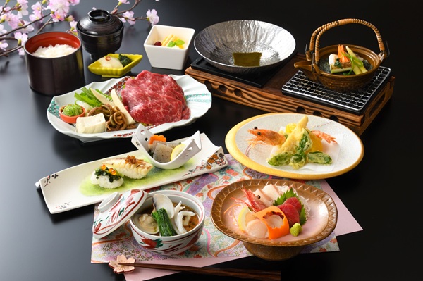 夜桜ツアーバスとホテルの宿泊がセットになったプランもある。夕食は、春鯛や蛤などの春らしい食材や、春ならではの山菜が登場する「奏(かなで)会席」が用意される。