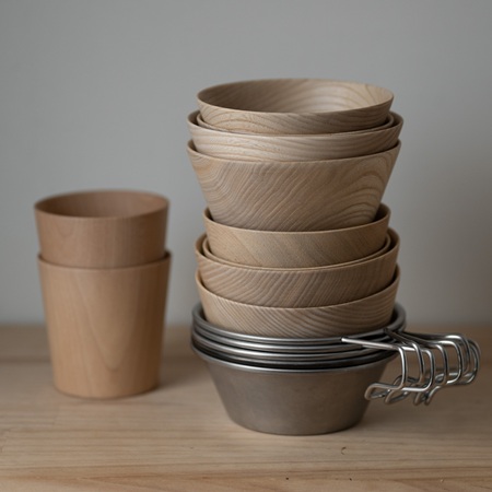 木地はすべて山中漆器の技法で製造しており、木の風合いと職人技が調和したデザインに。山登りやキャンプなどのアウトドアシーンはもちろん、自宅での食事にも馴染む実用性と美しさを兼ね備えている。