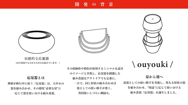 応量器とは大中小の器を組み合わせた食器で、修行中の禅僧は“必要な量”に応じて器を使い分けていたという。その収納性や僧侶が使用するミニマルな道具のイメージが評価され、アウトドアシーンでは応量器を踏襲した組み食器が定番に。一方で、同じ形状を重ねる設計は器として使い勝手が悪く、普段使いしづらい側面もある。