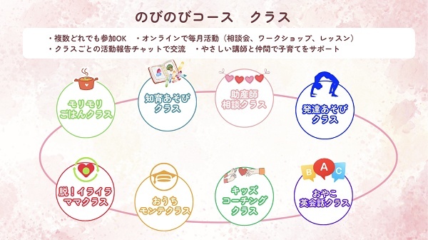 「心・からだ・知育 のびのびコース」は、モンテッソーリ教育の考えを主軸に、知育、親子の関わり、運動発達、食事・栄養、英語、子育て中の親のメンタルなど多角的にサポート。「助産師・離乳食アドバイザー・モンテッソーリ教師など各専門家への相談ライブ」「おうちモンテ実践ワークショップ」「知育あそびや運動能力を伸ばすあそびレッスン」「英会話レッスン」「講義動画見放題」「メンバー専用チャットでの情報交換」「先輩ママの知恵がみられる」といったサービスが利用できる。