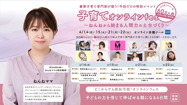 今回のサービス立ち上げを記念し、4月14(月)・15日(火)・21日(月)・22日(火)に、専門家たちから子どもの睡眠・離乳食・おひるねアート・お出かけ術・モンテッソーリ教育・愛着形成・キッズコーチング・こども英会話などが学べる、完全無料のオンラインイベントが開催される。申込は詳細ページで確認を。