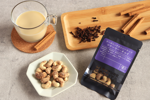 スパイス類もすべて有機栽培。乳化剤、光沢剤、香料といった食品添加物は一切使用されていない。シナモン、しょうが、カルダモン、クローブをふんだんに使用した、贅沢な純オーガニックのマサーラー・チャイ風味のカシューナッツを味わってみて。