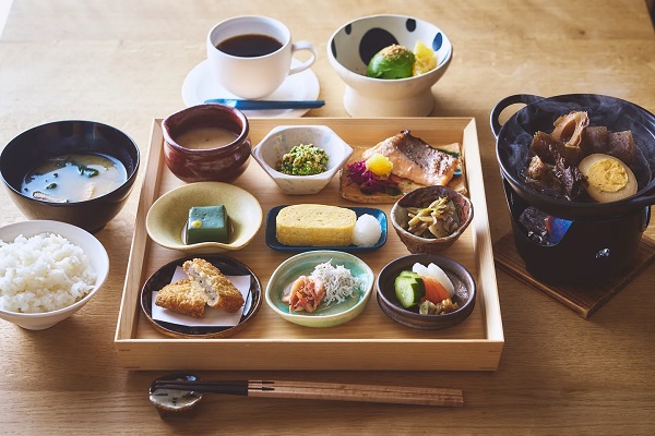 朝食は、「和処 若松」で、名物とろろ汁と9品の小鉢、静岡おでんがついた朝食を味わおう。