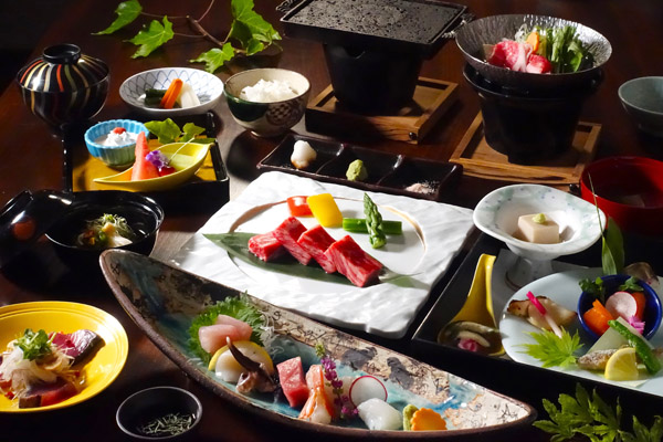 70周年記念特別プランの和食会席には「七種の海鮮刺し盛り」と「国産牛サーロインプレート焼き」など、