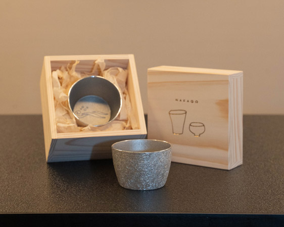また、これまでにポップアップストアや日本酒barでコラボレーションした、兵庫県小野市の錫製品ブランド「NAKAGO」とともに、銀波荘の思い出と感謝の気持ちを込めた、70周年記念のオリジナル酒器を製作。ショップにて販売するほか、「旬景ダイニング碧-AO-」などで日本酒をこの酒器で味わうことができる。独自の手法で生み出される表面のきらめきや、錫ならではのまろやかな口当たりを体験してみよう。