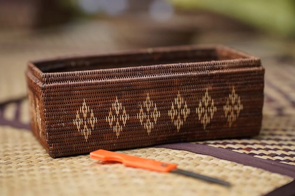 「ヤーンリパオ」とは、タイ南部に自生するツル性植物の名。この植物の茎を乾燥・加工し、手作業で精緻に編み込んで仕上げるバッグは、一点製作に約2か月を要するほど繊細な工程を経て生まれる。