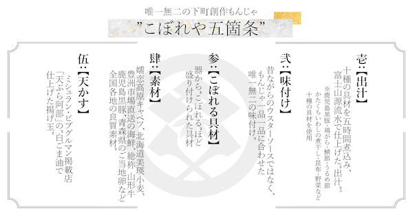 「こぼれや五箇条」は、創業以来「こぼれや」が大切にしてきた“唯一無二の下町創作もんじゃ”の哲学を言語化したものだ。出汁、味付け、盛り付け、素材、揚げ玉、そのすべてにこだわりを込め、「こぼれや」でしか味わうことのできない豪快さと上質の矛盾を楽しんでほしいという想いを五つの原則にまとめている。