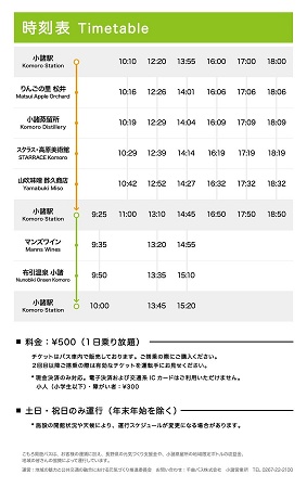 運行時間は9:25~18:50(主要停留所発着時刻)で、運賃は1日乗車券が大人500円/小人・障がい者300円、乗車券はバス車内および小諸観光案内所で販売しており、現金決済のみ対応している。