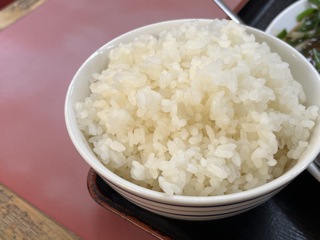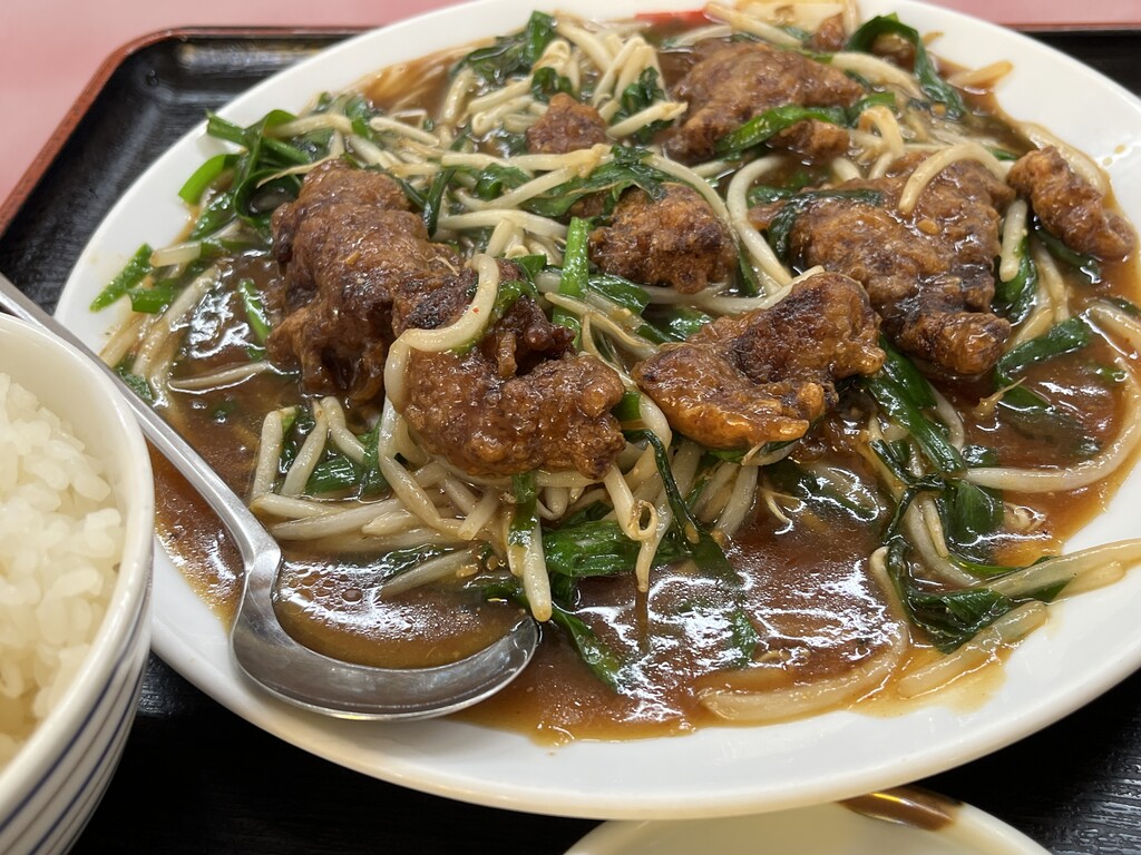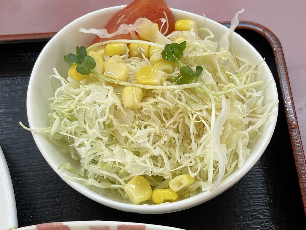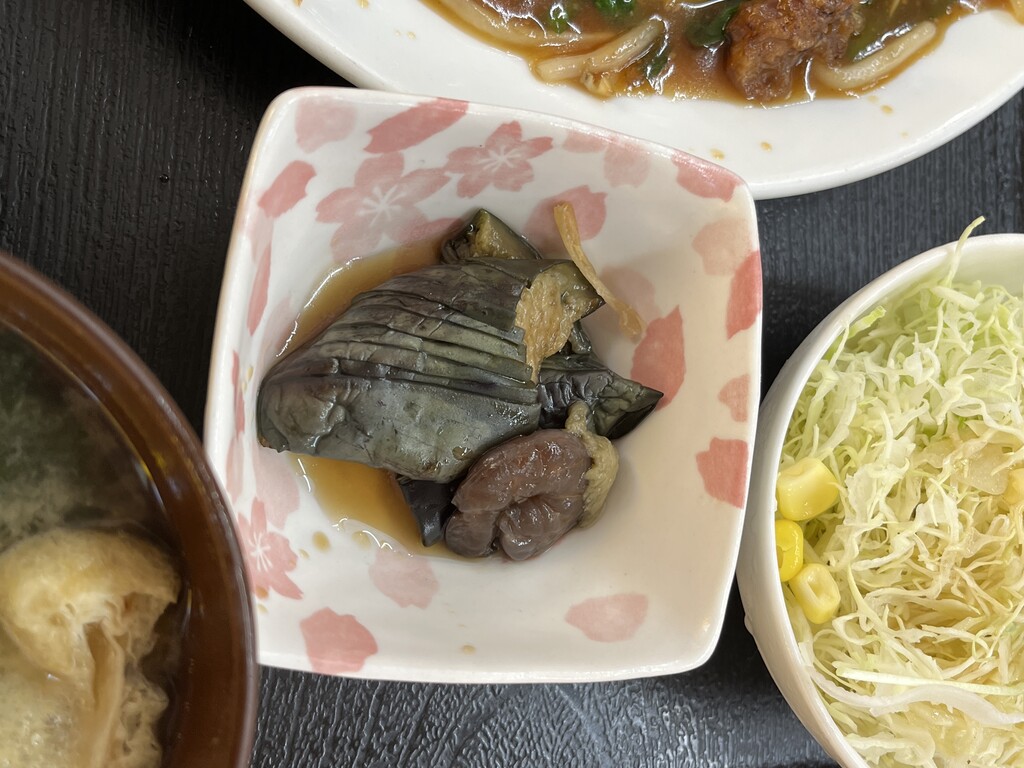 ニラレバ、一品、サラダ、お味噌汁、ごはん、香の物の定食♪